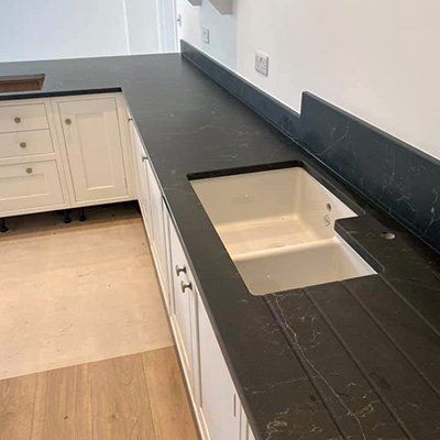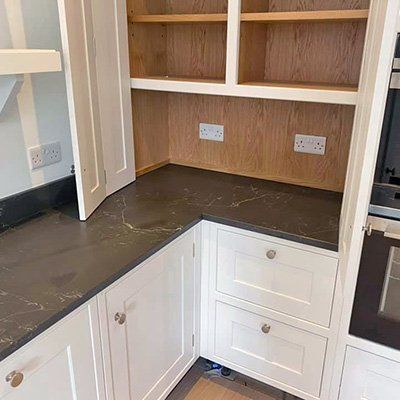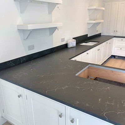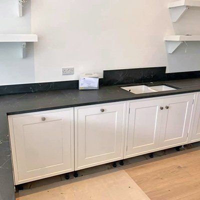 Although this kitchen wasn't anywhere near finished, we just had to show you this project...huge lengths of our Pietra Grey quartz in a honed finish with white veins to both contrast and complement this impressive white shaker style kitchen. Upstands along the walls and contrasting white undermounted sink, all subtly topped off with drainer grooves manufactured into the quartz worktop. We even continued the worktop into the tall cupboard!