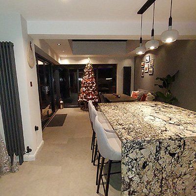This dark grey matt finish kitchen with copper inset handles is beautifully complemented by our fabulous Pegasus Granite worktops and feature island. The inset sink and tap take the copper details to another level, each design detail highlighted even more by the gold and copper tones of this wonderfully patterned granite. Our craftsmen fabricated bespoke drainer grooves directly into the granite worktops enabling the granite pattern flow without interruption. We think you’ll agree the island makes a stunning centre piece to this outstanding kitchen, so smooth even the family cats are attracted to it! All topped off with a delightful Christmas tree - WOW!!