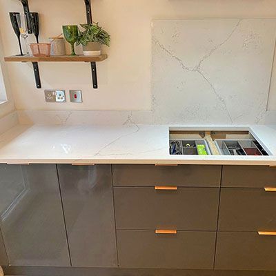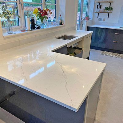 Crisp white worktop, complete with graceful veins of grey gliding through...even as far as the splashback!